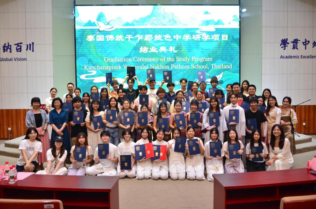 El pasado 29 de julio se llevó a cabo la ceremonia de clausura del Programa de Estudio e Investigación de la Lengua y Cultura Chinas en la Escuela Secundaria Kanchanaphisek de Nakhon Pathom (Tailandia), en el Salón de Conferencias Internacional del Edificio Hongwen. Entre los asistentes estuvieron Zeng Chuanfang, decana del Colegio Internacional de nuestra universidad; Chen Pai, secretario del Comité del Partido; Zhang Yong, vicedecano; Lu Caihong y Liu Meifang, profesoras de chino de la escuela secundaria; Huang Liangcheng, director general de la empresa Wei Yi Chinese (Guangzhou) Education Technology Co., Ltd., además de todos los estudiantes participantes, personal del programa y voluntarios.