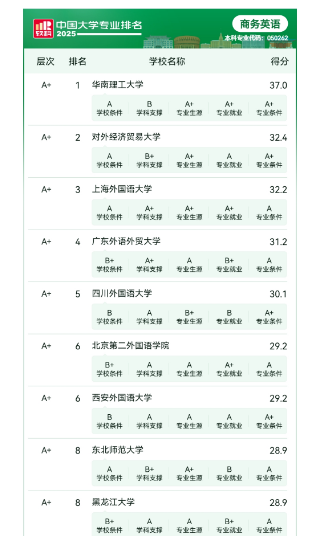 Recientemente, Soft Science, una institución de evaluación profesional de la educación superior en China, publicó el "Ranking de Especializaciones de Universidades Chinas de Soft Science 2025". El programa de inglés comercial de nuestra universidad ha alcanzado un nuevo máximo en el ranking, situándose en la categoría A+ y ocupando el quinto puesto a nivel nacional, además de ser el primero en la región centro-occidental de China. En los Rankings de Universidades Chinas de Soft Science de 2021 a 2024, el programa de inglés comercial mantuvo consistentemente la categoría A+ (ocupando la séptima posición a nivel nacional).